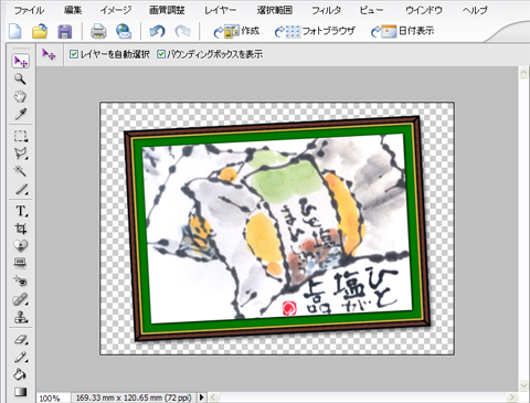 まずはフォトショップで額縁などの画像を作っておいて、その背景は白とグレーの升目(透過している部分)を見えるようにしておきます^^